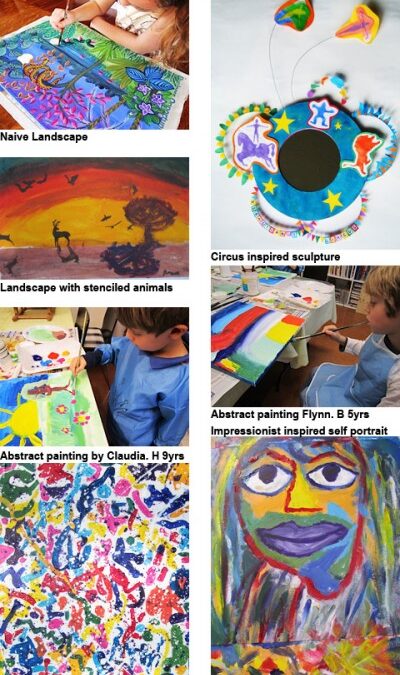 Children painting and sculpting in a art studio